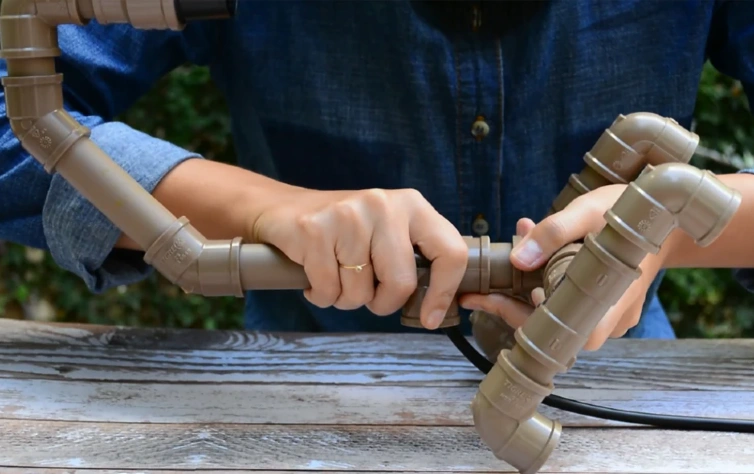 Passo 4: Agora, inicie a montagem da parte superior da luminária. Una o conector luva ao cano de 2cm, e depois una esse ao joelho de 90°. Utilize outro cano de 2cm para uni-lo ao joelho de 45°.