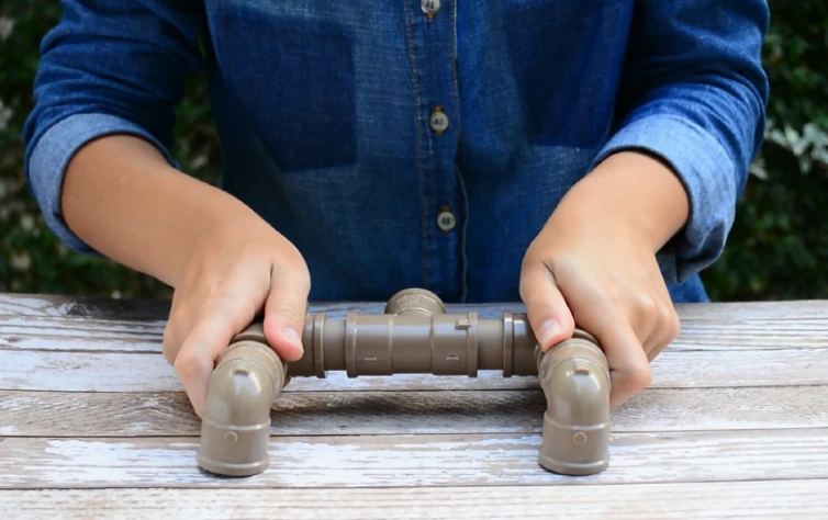Passo 2: Iniciando pela base, encaixe os 4 joelhos de 90° aos 4 canos de 2cm. Então, una duas partes com um conector T e e as outras duas partes com outro conector T. Use outros 2 canos de 2cm para unir os pés a outro conector T.